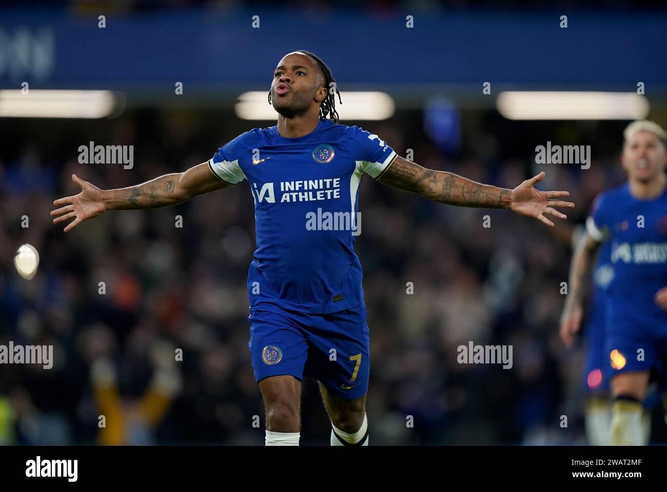 Chelsea’s raheem sterling celebrates scoring his sides third goal
